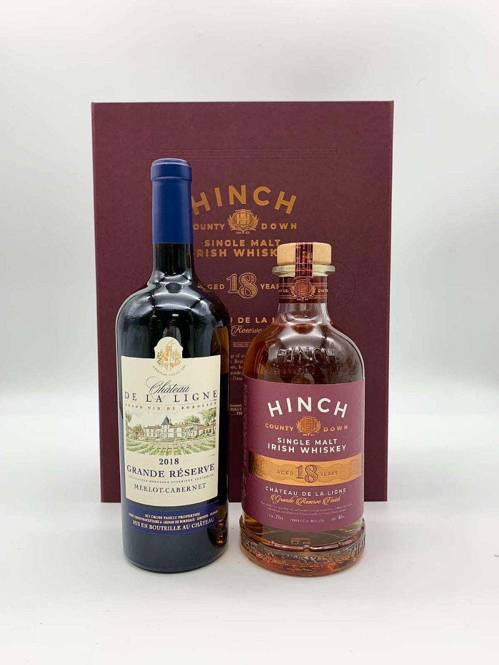 This Gift Presentation Box is a marriage of our founder Terry Cross’s two great passions – Hinch Irish Whiskey distillery in County Down, Ireland and Château De La Ligne in Bordeaux, France Casks containing the Château’s first ever vintage of Grande Reserve, both Cabernet Sauvignon & Merlot, were emptied and refilled with the Irish Single Malt whiskey that has spent 18 years maturing in Kentucky bourbon barrels. The addition of a further six-month finishing period in the Grande Reserve wine casks has delivered this majestic whiskey for you to enjoy. We felt it would only be fair to also include, for your enjoyment, a bottle of the Château de la Ligne Grande Reserve which has played such an important role in our 18-Year-Old Single Malt.